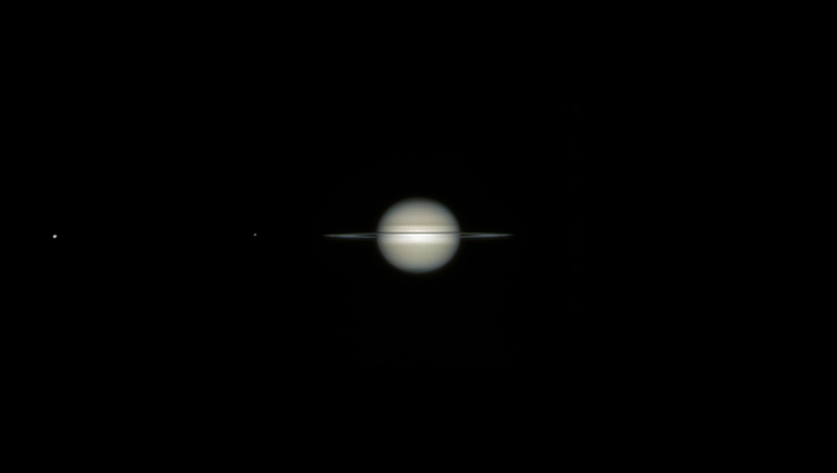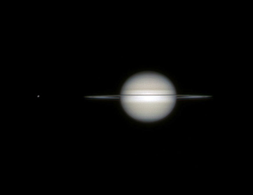 Le satellite le plus brillant, à gauche, est Rhea. Le tout petit, situé entre Rhea et les anneaux, est Encelade. Les bandes nuageuses qui ceinturent la planète sont bien visibles ainsi que l'ombre des anneaux sur la planète. Originalité cette année : les anneaux de Saturne sont presque vus par la tranche, comme celà se produit tous les 14 ans 1/2, lorsque l'orbite de la Terre passe dans le plan des anneaux. Pour ces satellites, j'ai fait une photo avec une surexposition volontaire pour mettre en évidence ces faibles petits points limineux, puis j'ai utilisé Photoshop pour utiliser cette image comme calque, et je l'ai collée sur celle de Saturne