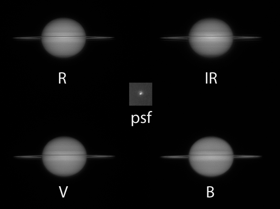 La planche ci-dessous montre que l'image était plutôt fine avec le filtre rouge mais franchement beurk avec le filtre infra-rouge. J'ai d'ailleurs jeté cette couche à la poubelle pour ne travailler finalement qu'avec les couches rouge, verte et bleue. L'image d'une étoile (ce que les astrophotographes appellent une psf) montre une partie seulement des anneaux de diffraction de la lumière (le disque d'Airy des astrophotographes), témoignant de la qualité finalement assez moyenne du ciel, probablement du fait de l'humidité de l'air. Mais nos logiciels d'astronomie, comme Autostakkert, Astrociel, Winjupos font des merveilles...