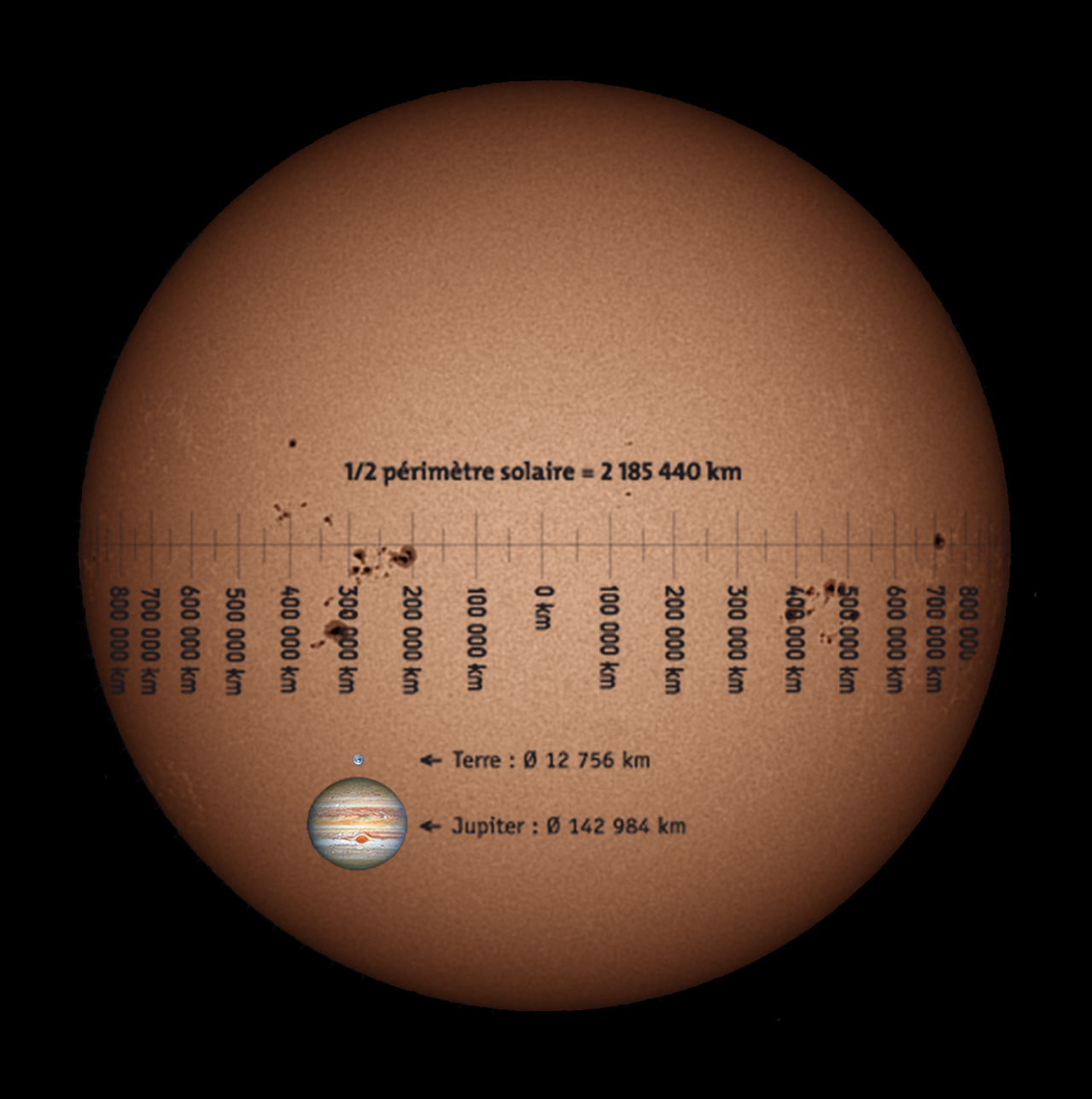Le p'tit coup de "règle à Colmic" qui va bien, pour mesurer ces groupes de taches. Le groupe de gauche fait environ 175 000 km de long et celui de droite 100 000 km. Comme d'habitude, vous avez Jupiter et la Terre à l'échelle pour toucher du doigt ce que représentent ces milliers de kilomètres