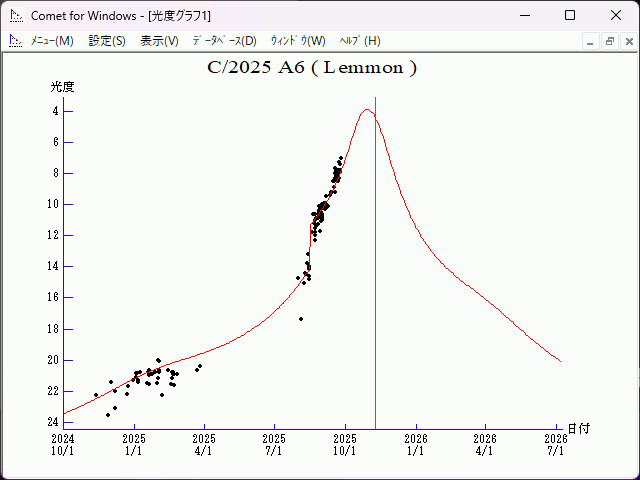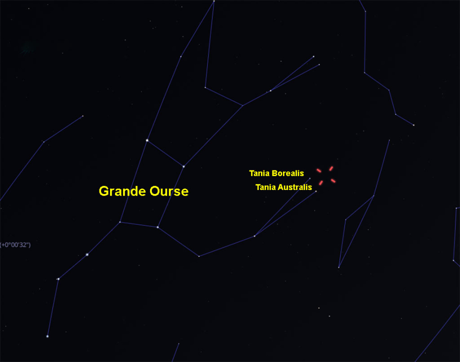Qu'est que je fais quand l'envie de faire pipi me pousse hors du lit et que je constate que la nuit est bien claire ? Je vais faire un petit tour dehors, jumelles en main ! La comète C/2025 A6 Lemmon y était parfaitement visible dans mes J 10x50 mm, un peu à droite de Tania Boeralis et Tania Australis, deux étoiles de la Grande Ourse. Ce matin, la magnitude de la comète était donnée à 6,2